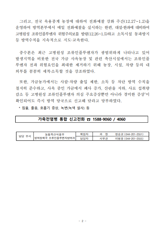 ▼ [농식품부 12.25] 이번 겨울철, 고병원성 조류인플루엔자 감염력이 강해 방역관리 한층 강화