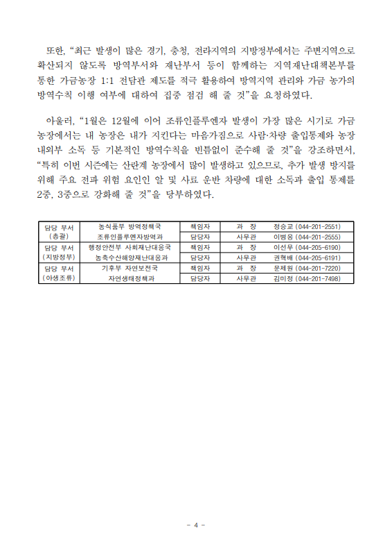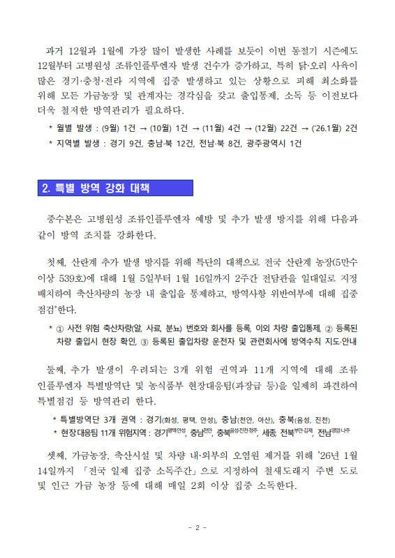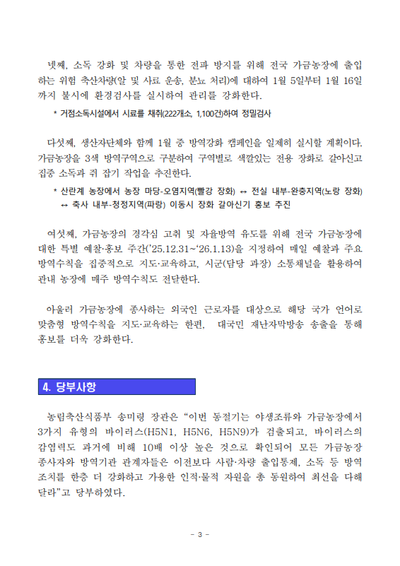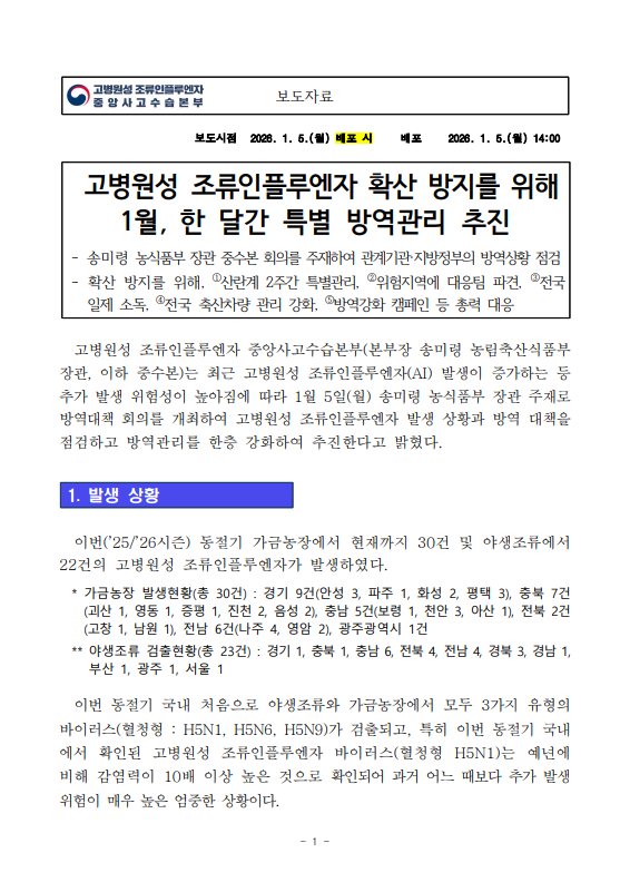 [농식품부 01.05] 고병원성 조류인플루엔자 확산 방지를 위해 1월, 한 달간 특별 방역관리 추진