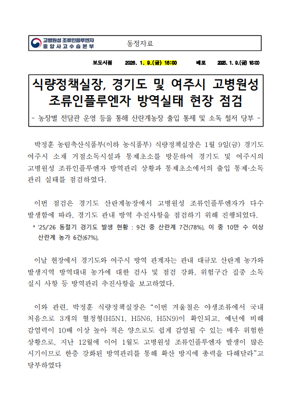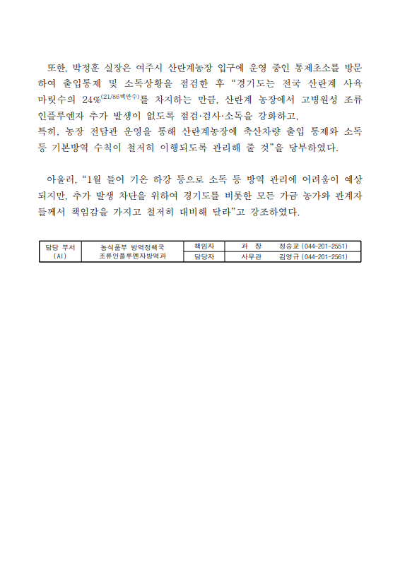 [농식품부 01.09] 식량정책실장, 경기도 및 여주시 고병원성 조류인플루엔자 방역실태 현장 점검