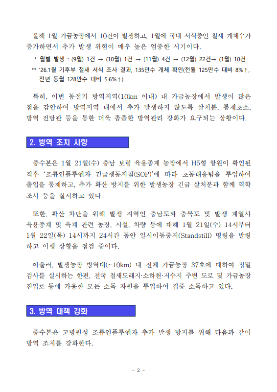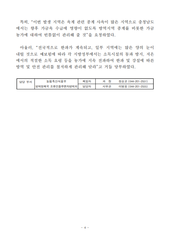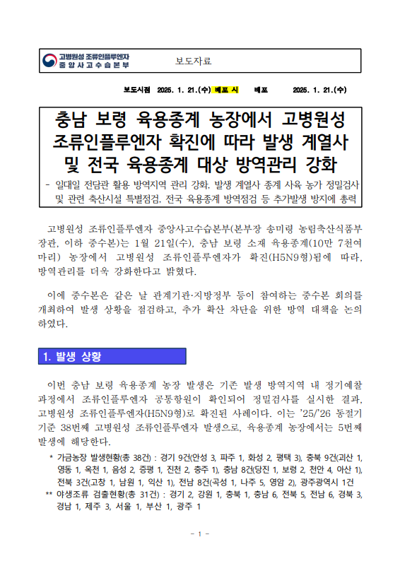 [농식품부 01.21] 충남 보령 육용종계 농장 고병원성 조류인플루엔자 확진에 따라 방역관리 강화