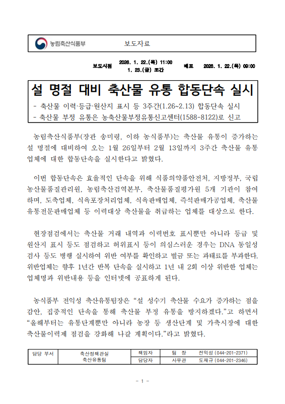 [농식품부 01.22] 설 명절 대비 축산물 유통 합동단속 실시