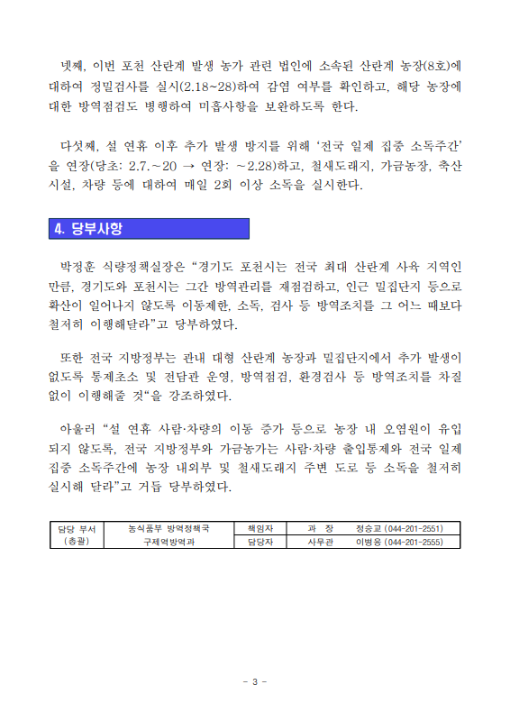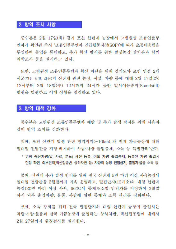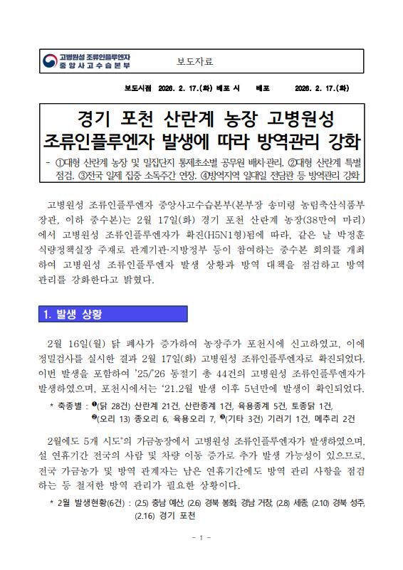 [농식품부 02.17] 경기 포천 산란계 농장 고병원성 조류인플루엔자 발생에 따라 방역관리 강화