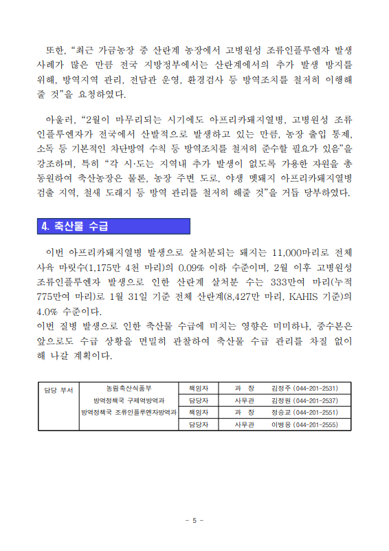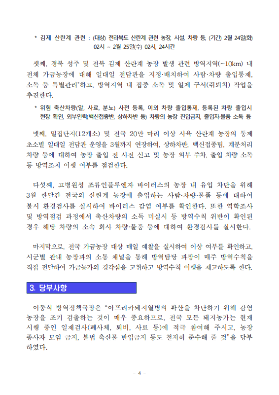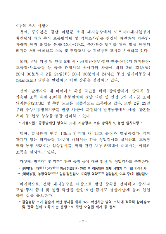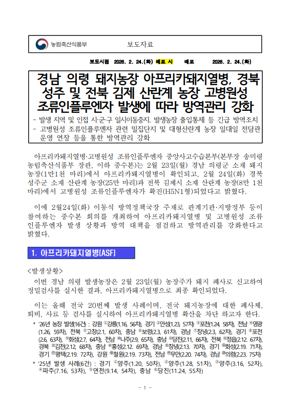 [농식품부 02.24] 경남 의령 돼지농장 아프리카돼지열병, 경북 성주 및 전북 김제 산란계농장 고병원성 조류인플루엔자 발생에 따라 방역관리 강화