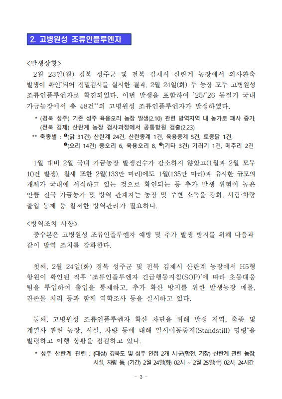 ▲ [농식품부 02.26] 전남 구례 육용오리농장 고병원성 조류인플루엔자 발생에 따라 방역관리 강화