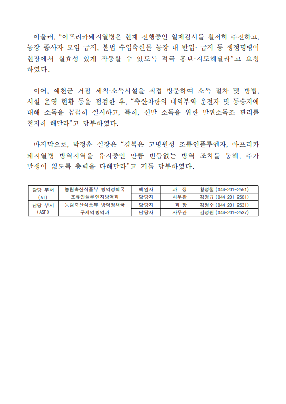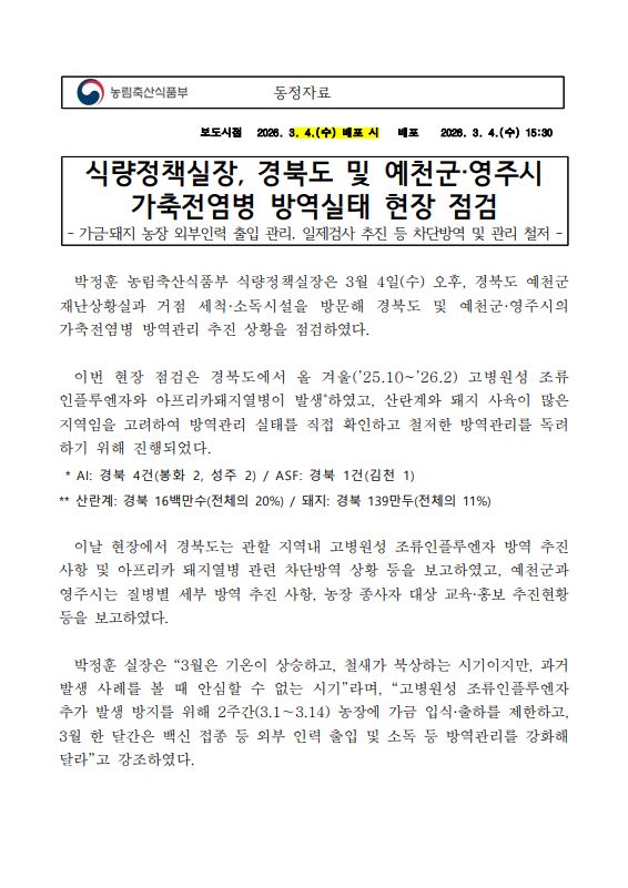 [농식품부 03.04] 식량정책실장, 경북도 및 예천군·영주시 가축전염병 방역실태 현장 점검