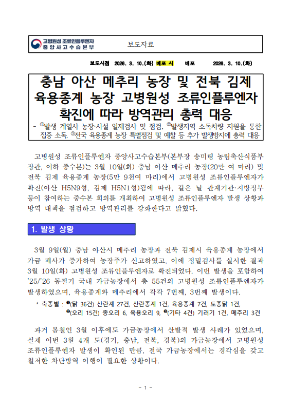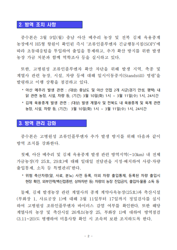 [농식품부 03.10] 충남 아산 메추리 농장 및 전북 김제 육용종계 농장 고병원성 조류인플루엔자 확진에 따라 방역관리 총력 대응