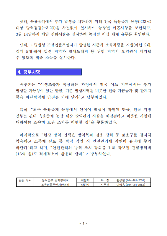 ▼ [농식품부 03.09] 고병원성 조류인플루엔자 발생농장 다수 방역 미흡사항 확인, 보상금 감액 등 엄정 조치