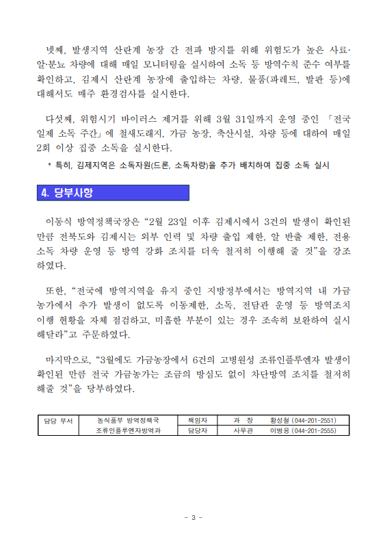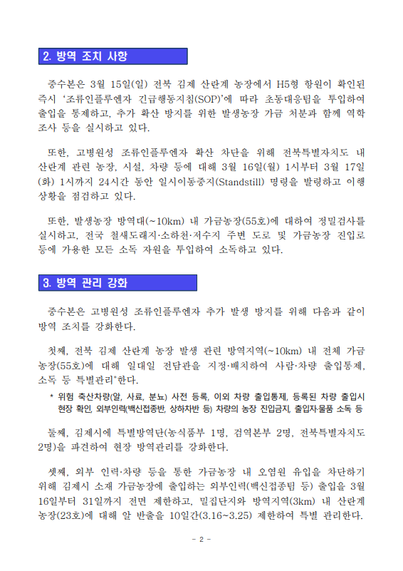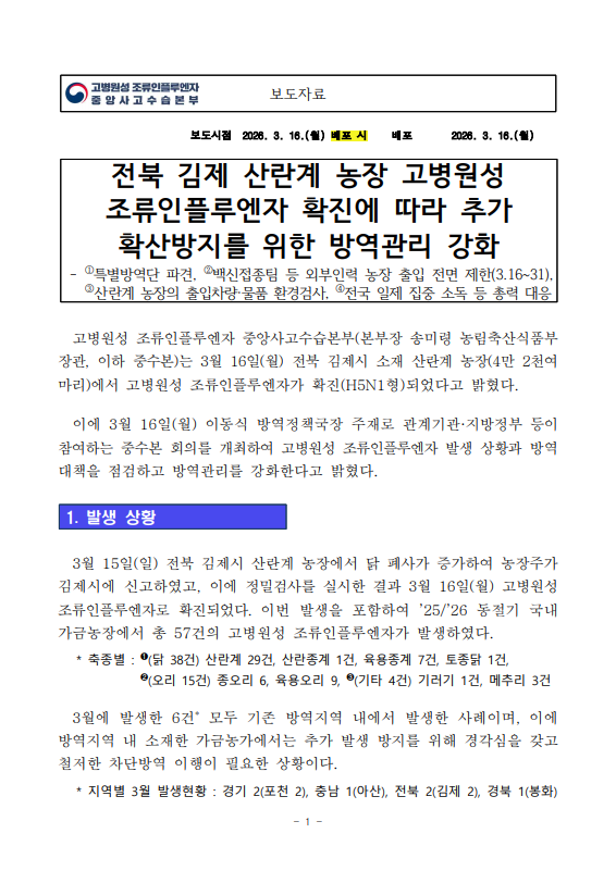 [농식품부 03.16] 전북 김제 산란계 농장 고병원성 조류인플루엔자 확진에 따라 추가 확산방지를 위한 특별 방역대책 추진