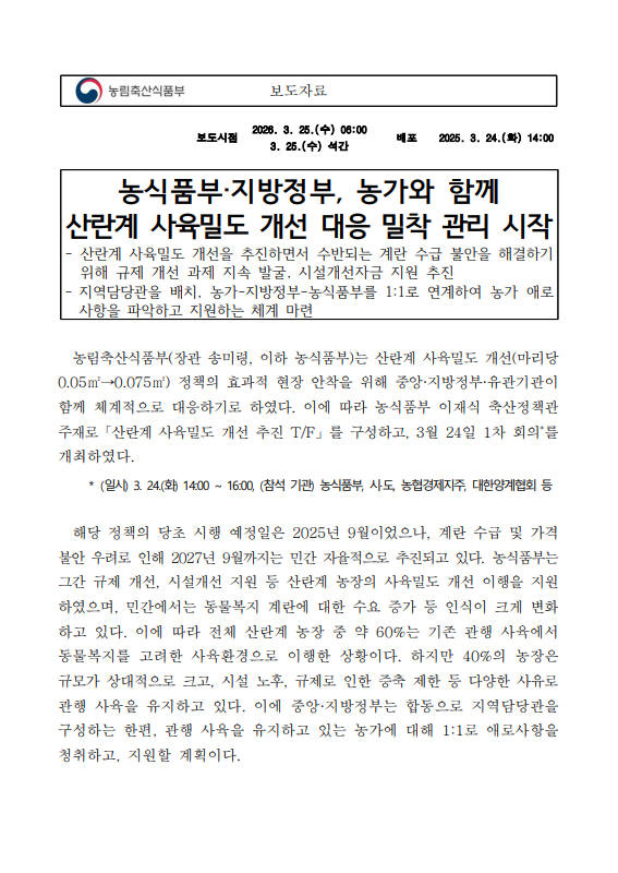 [농식품부 03.25] 농식품부 지방정부, 농가와 함께 산란계 사육밀도 개선 대응 밀착 관리 시작