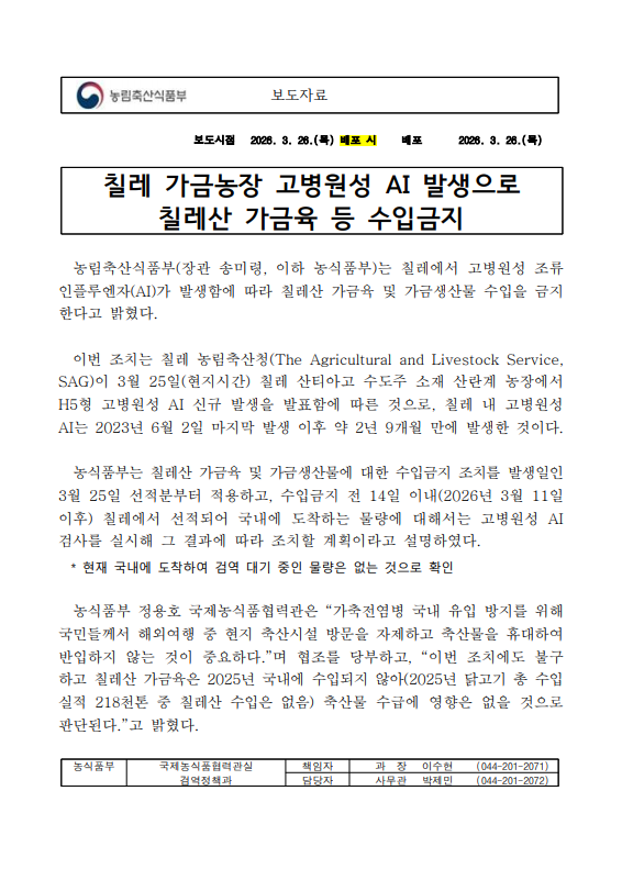 [농식품부 03.26] 칠레 가금농장 고병원성 AI 발생으로 칠레산 가금육 등 수입금지