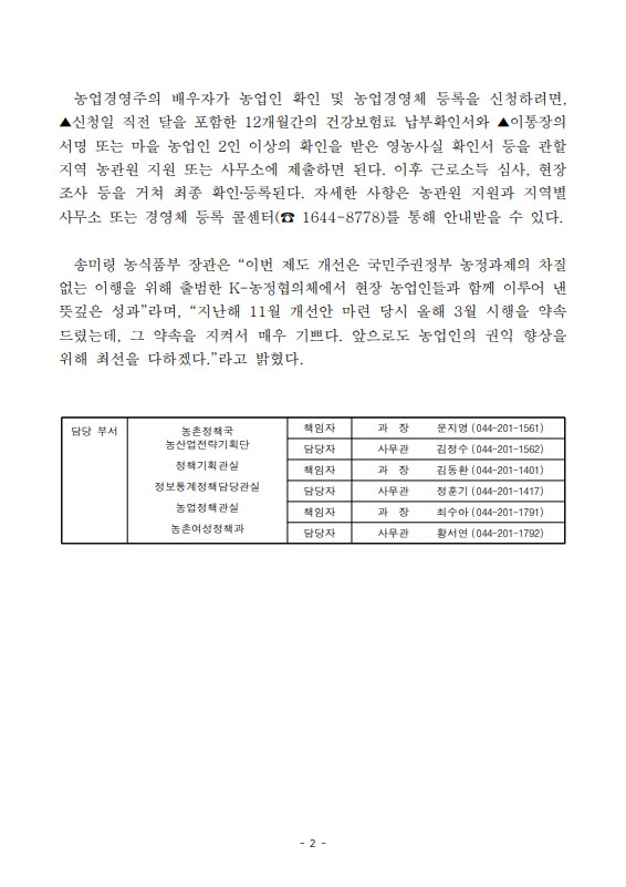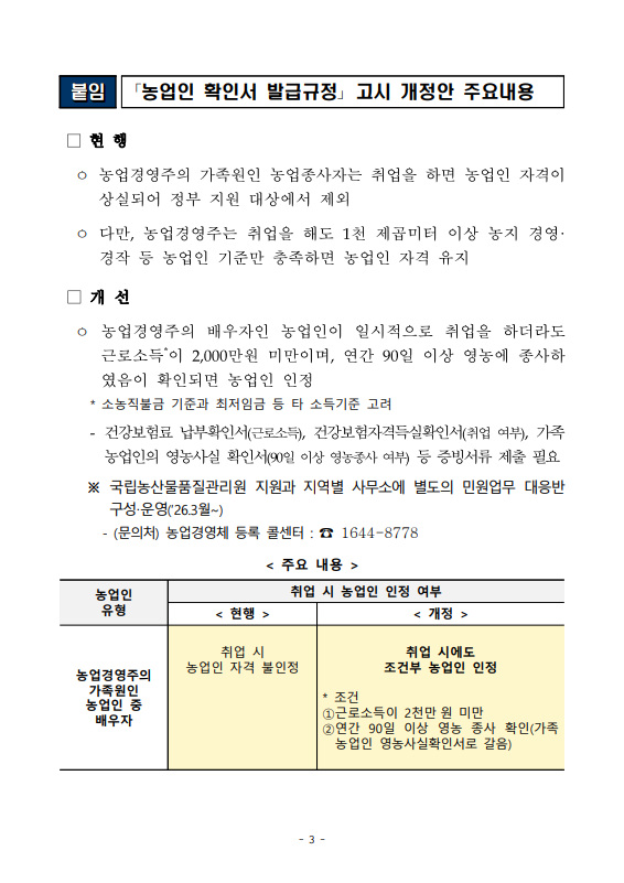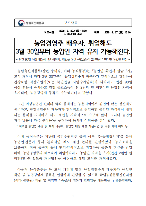 [농식품부 03.30] 농업경영주 배우자, 취업해도 3월 30일부터 농업인 자격 유지 가능해진다