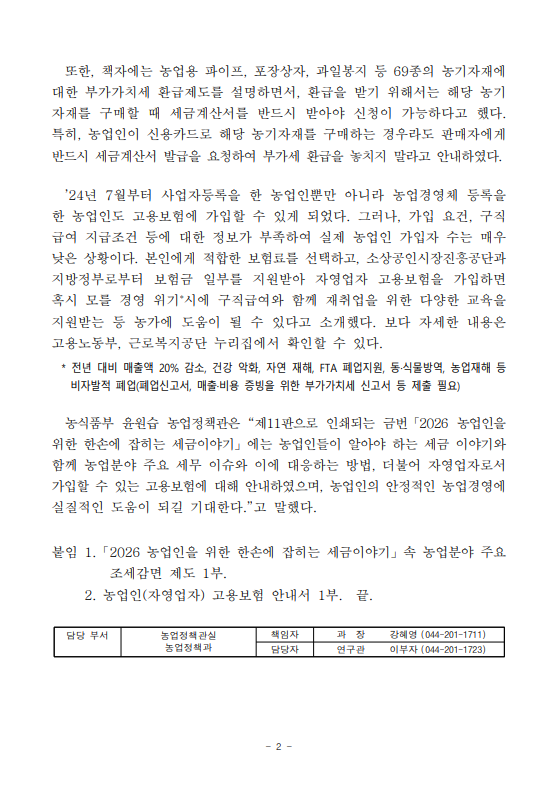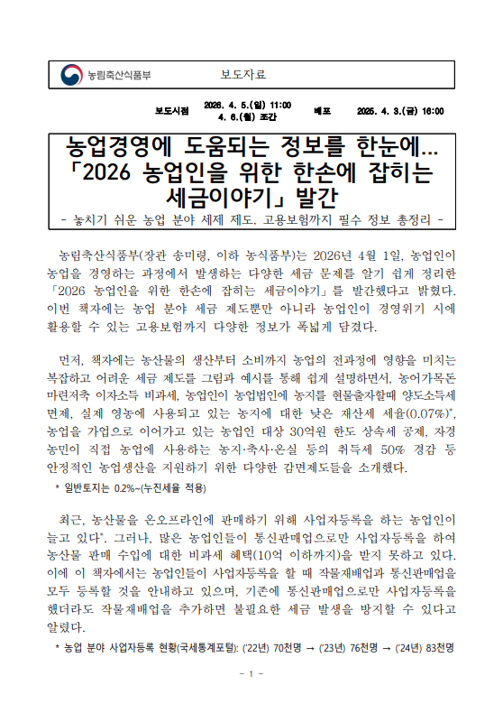 [농식품부 04.06] 농업경영에 도움되는 정보를 한눈에 「2026 농업인을 위한 한손에 잡히는 세금이야기」 발간