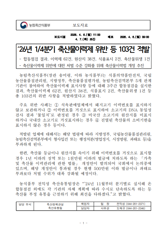 [농식품부 04.07] 26년 1/4분기 축산물이력제 위반 등 103건 적발