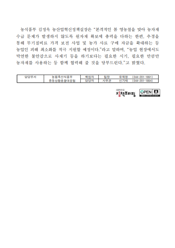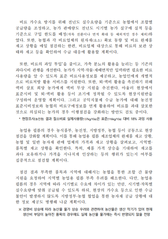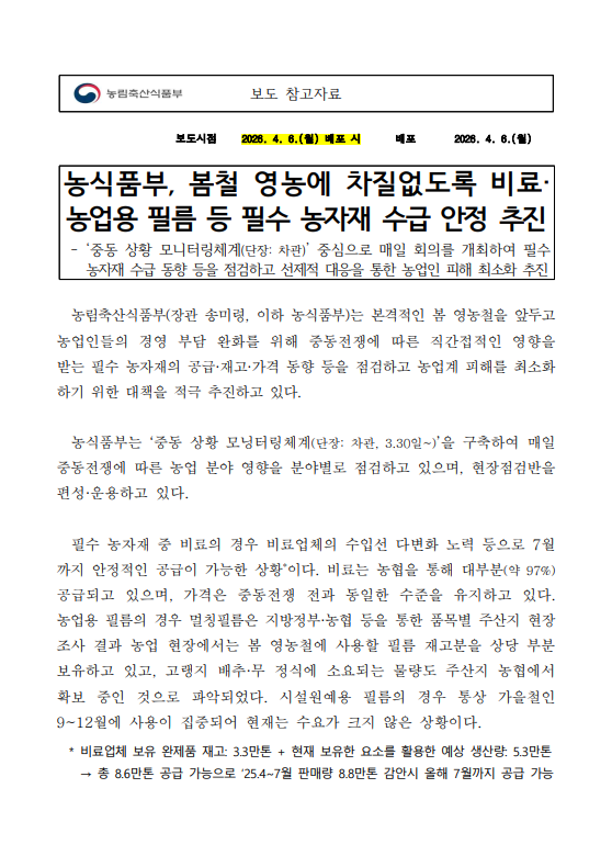 [농식품부 04.06] 농식품부 봄철 영농에 차질없도록 비료· 농업용 필름 등 필수 농자재 수급 안정 추진