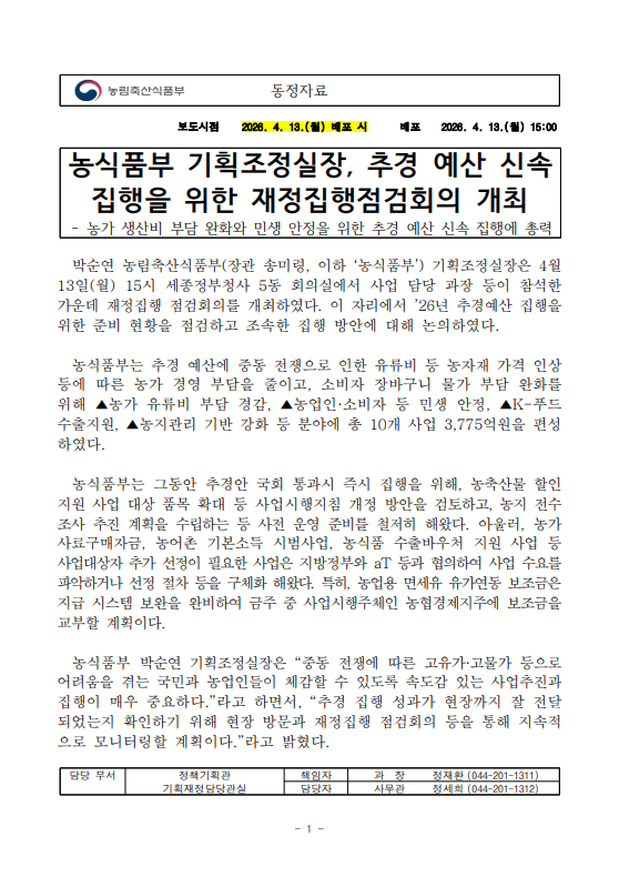 [농식품부 04.13] 농식품부 기획조정실장, 추경 예산 신속 집행을 위한 재정집행점검회의 개최
