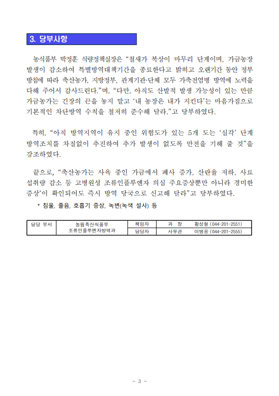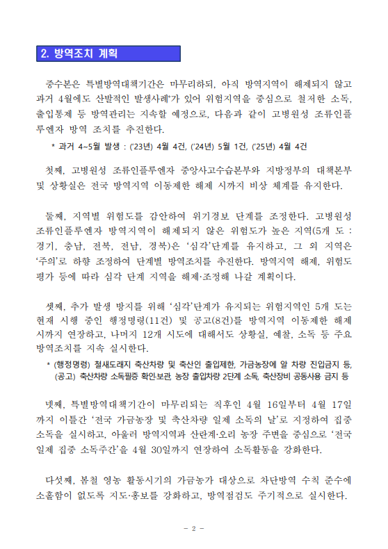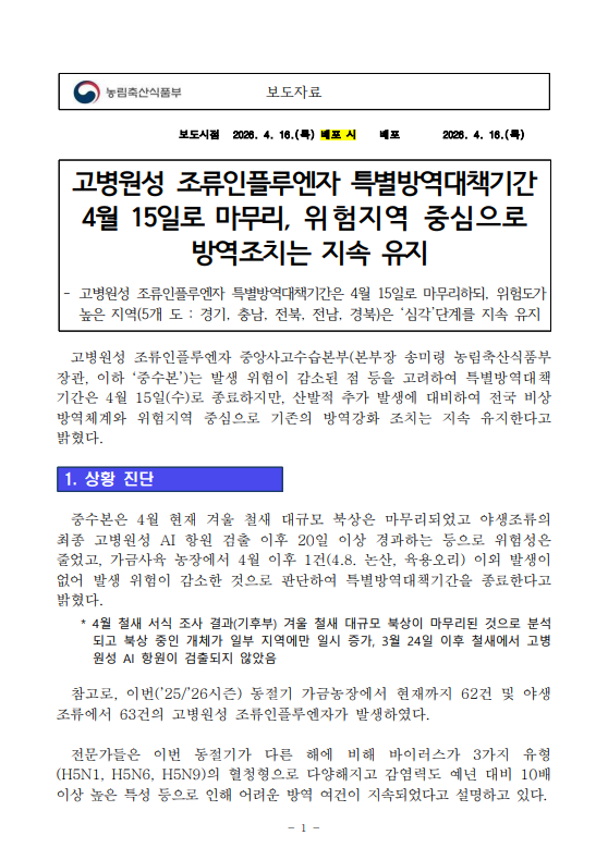 [농식품부 04.16] 고병원성 조류인플루엔자 특별방역대책기간 4월 15일로 마무리 위험지역 중심으로 강화된 방역조치는 지속 유지