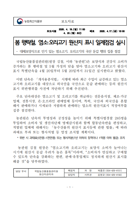 [농관원 04.20] 봄 행락철, 염소 오리고기 원산지 표시 일제점검 실시