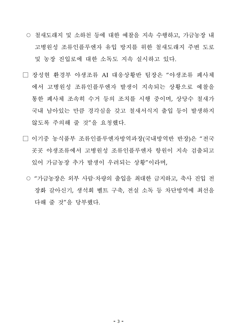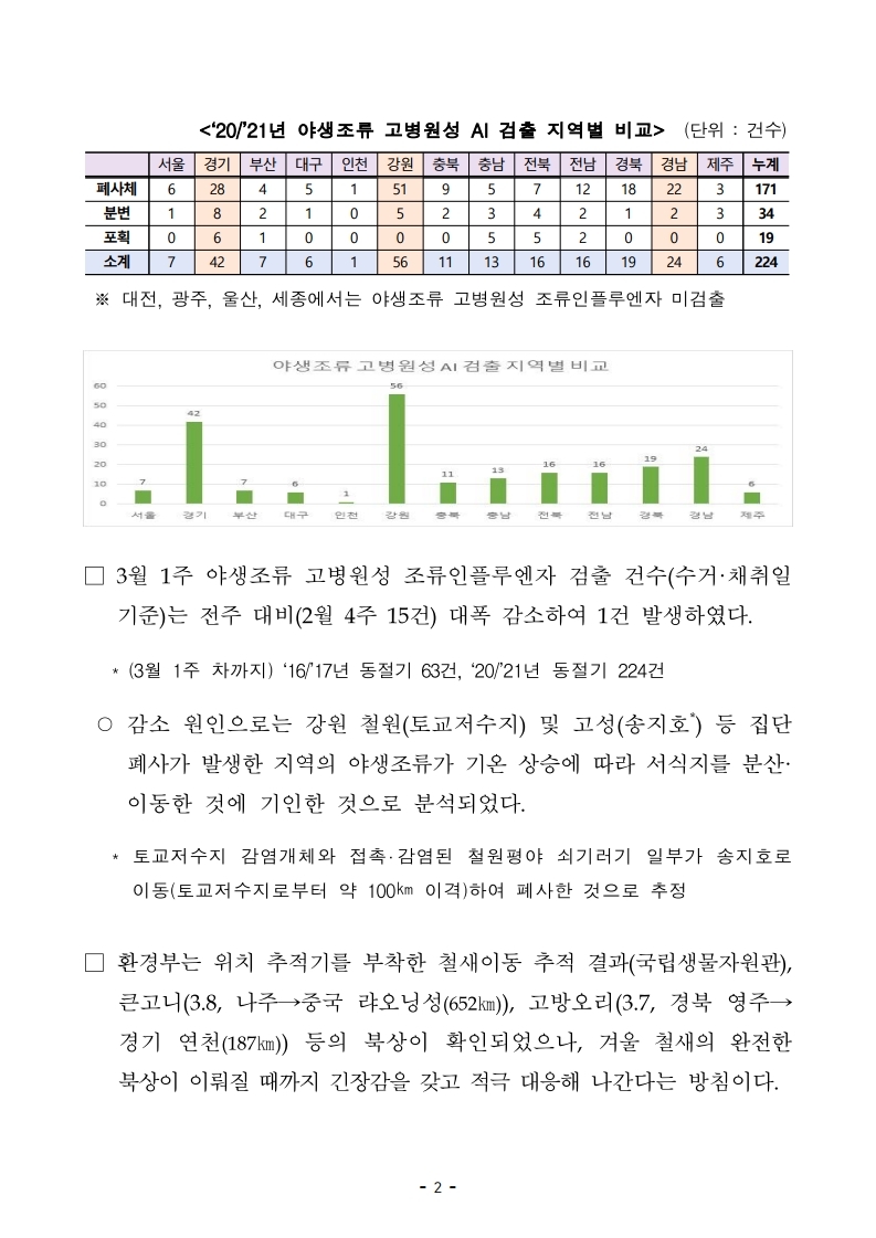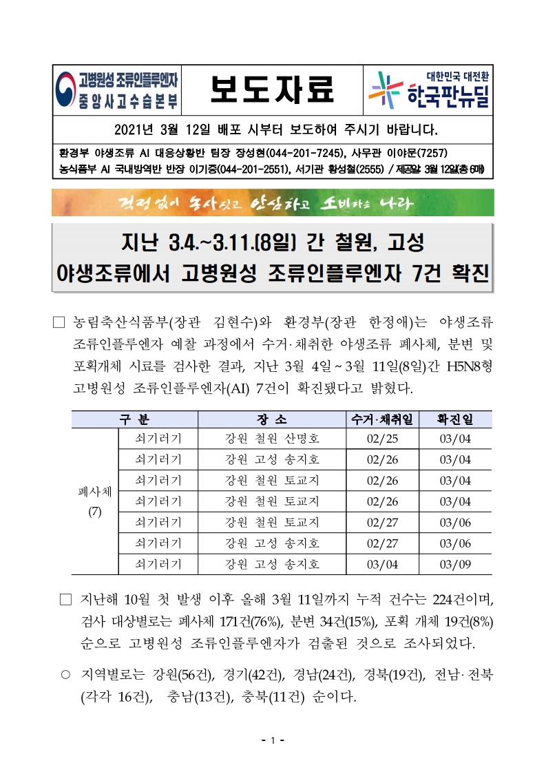 [농식품부 3.12] 지난 3.4._3.11.(8일) 간 철원, 고성 야생조류에서 고병원성 조류인플루엔자 7건 확진