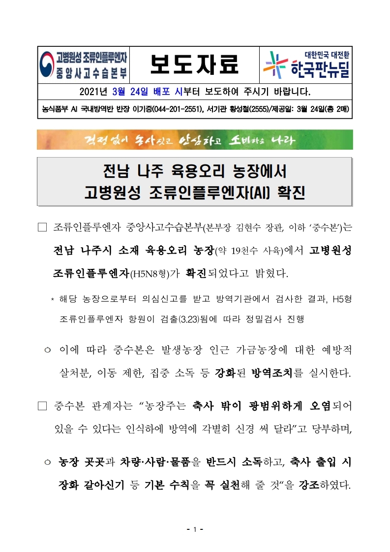 [농식품부 3.24] 전남 나주 육용오리 농장에서 고병원성 조류인플루엔자(AI) 확진