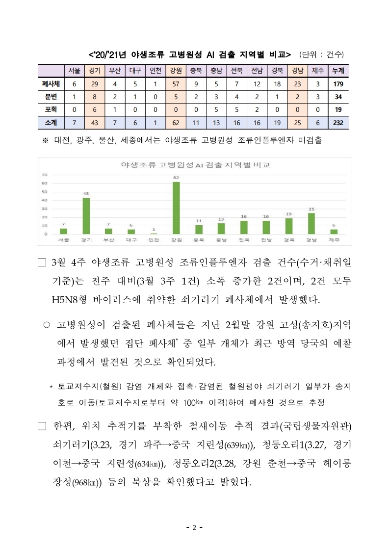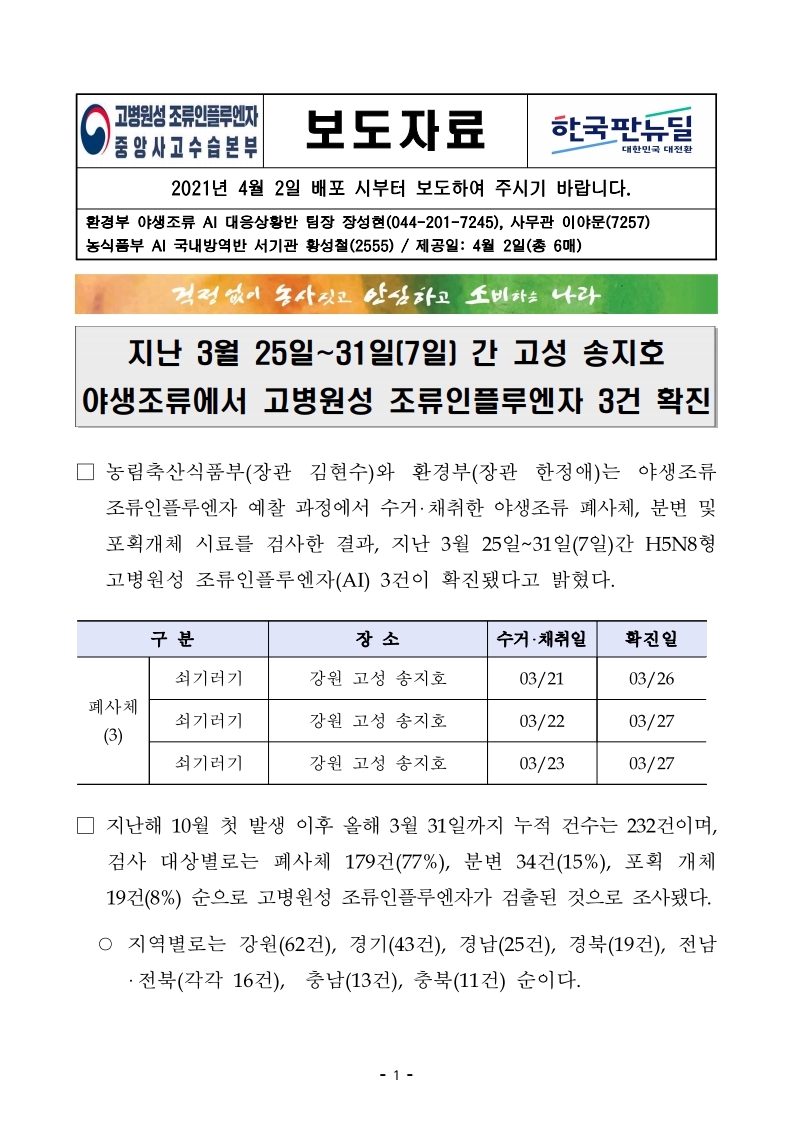 [농식품부 4.2] 지난 3월 25일_31일(7일) 간 고성 송지호 야생조류에서 고병원성 조류인플루엔자 3건 확진