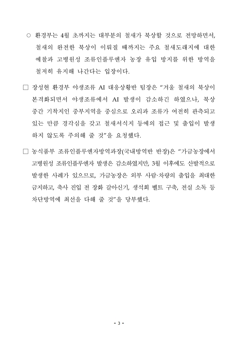 ▼ [농식품부 3.28] 조류인플루엔자 특별방역대책기간 이후에도 취약요인에 대한 강화된 방역조치는 유지