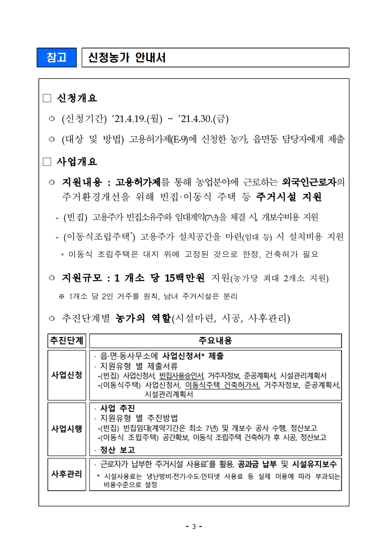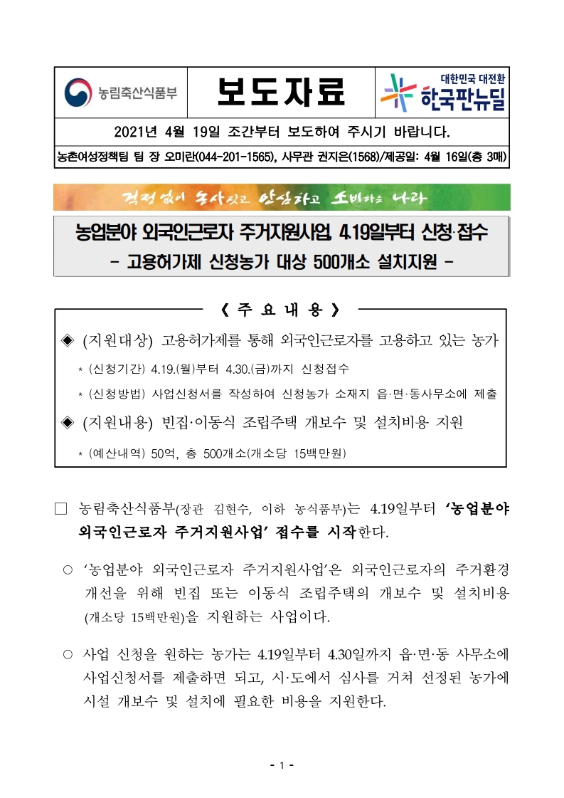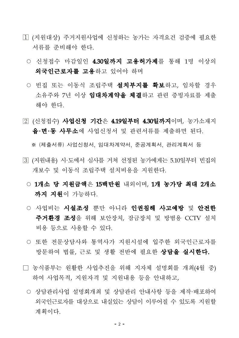 [농식품부 4.19] 농업분야 외국인근로자 주거지원사업, 4.19일부터 신청 접수
