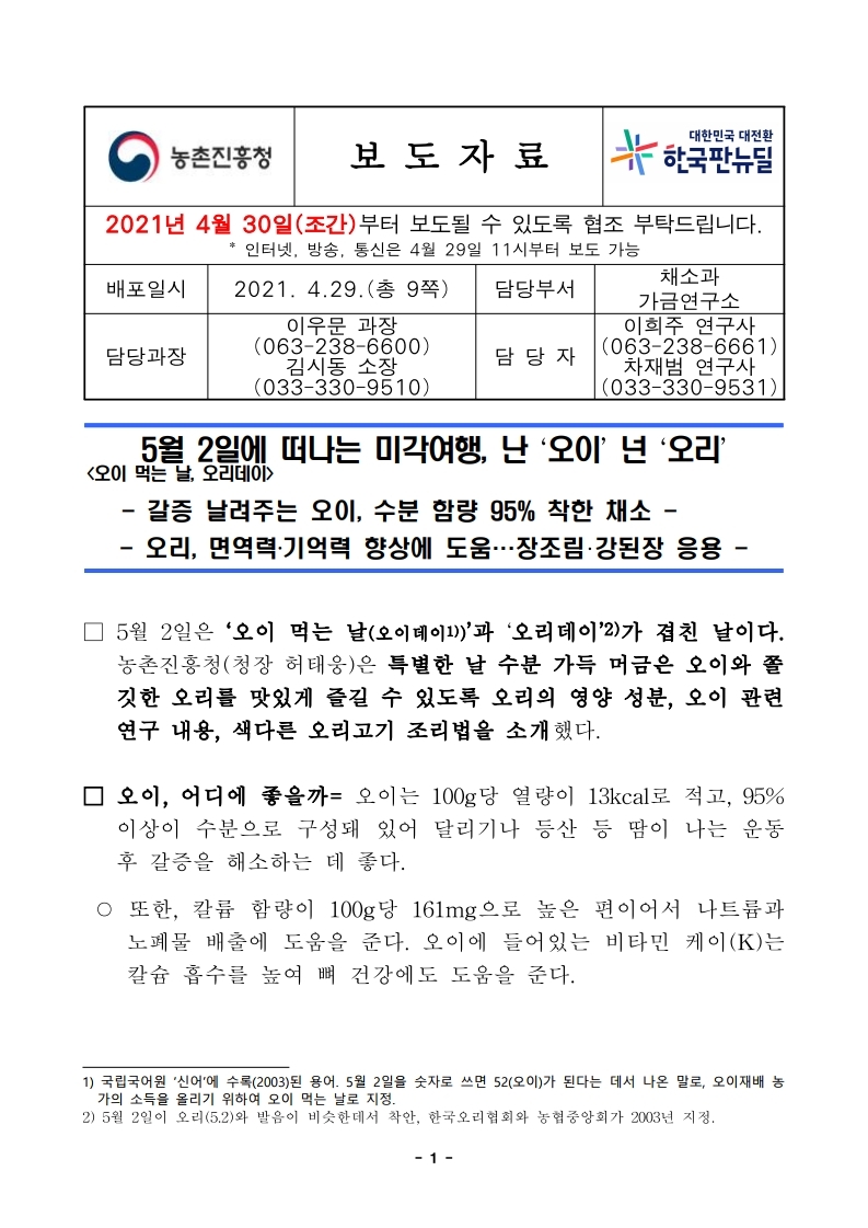 [농촌진흥청 4.30] 5월 2일에 떠나는 미각여행, 난 오이 넌 오리
