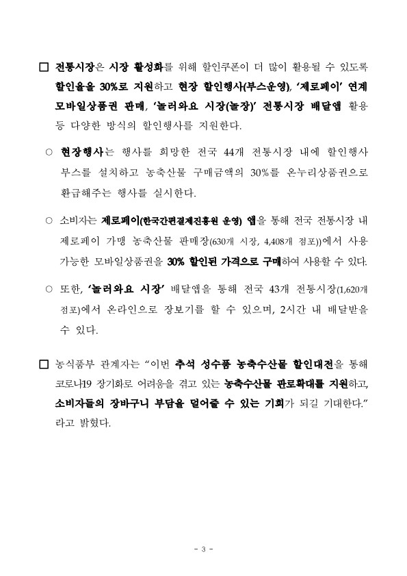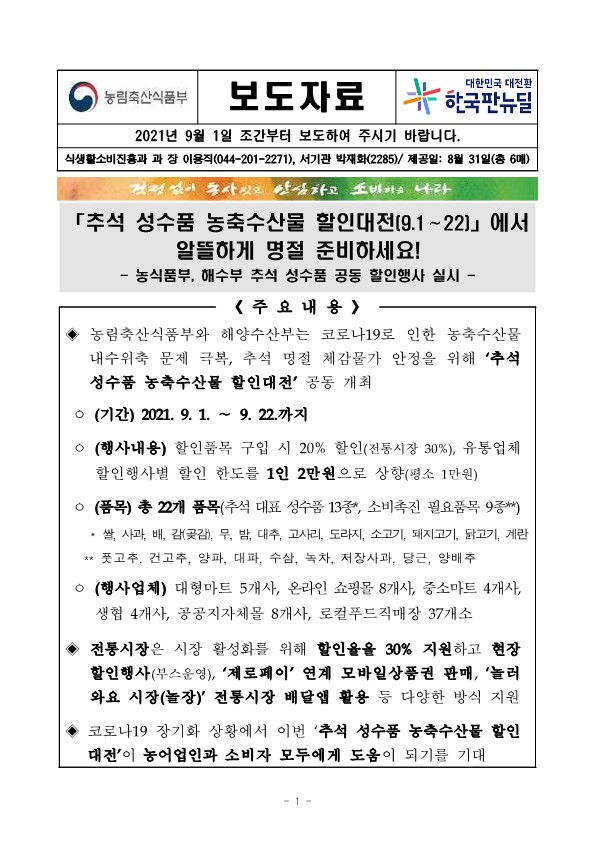 [농식품부 8.31] 「추석 성수품 농축수산물 할인대전(9.1~22)」에서 알뜰하게 명절 준비하세요!