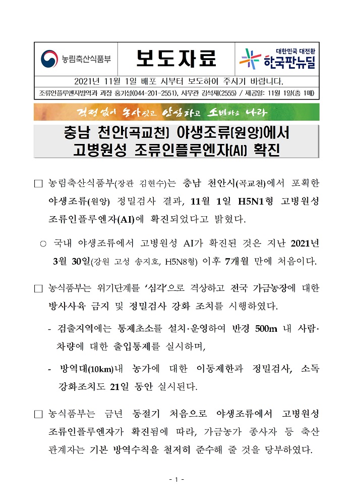 [농식품부 11.1] 충남 천안(곡교천) 야생조류(원앙)에서 고병원성 조류인플루엔자(AI) 확진