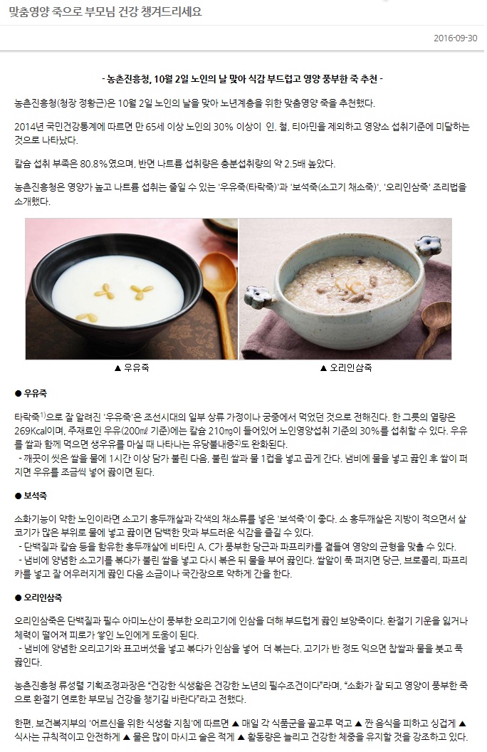 [농촌진흥청] 맞춤영양 죽으로 부모님 건강 챙겨드리세요