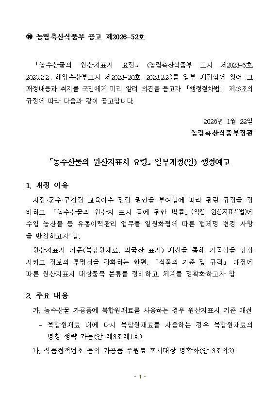 농수산물의 원산지 표시 요령 고시 일부개정 행정예고(~26.2.12. 의견조회)