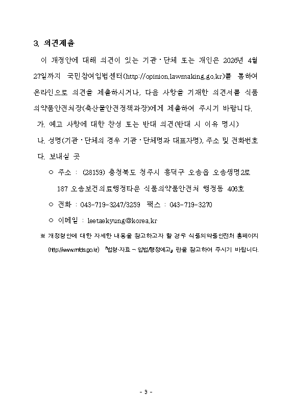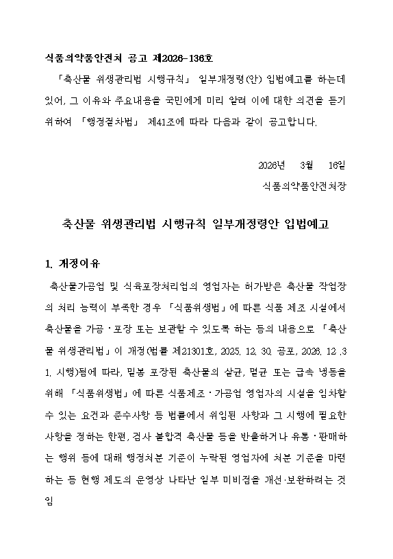 「축산물 위생관리법 시행규칙」 일부개정령안 입법예고(~26.4.27. 의견조회)