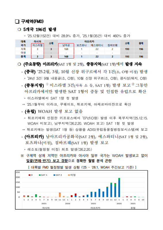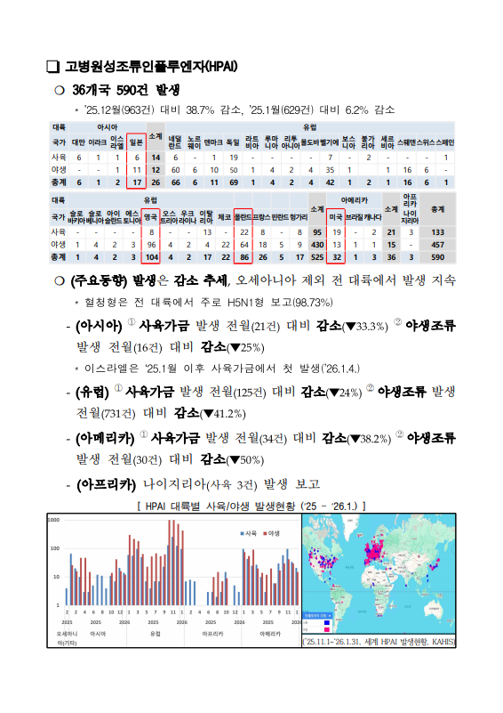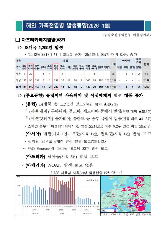 [검역본부] 2026년 1월 해외 가축전염병 발생동향(ASF, HPAI, 구제역)